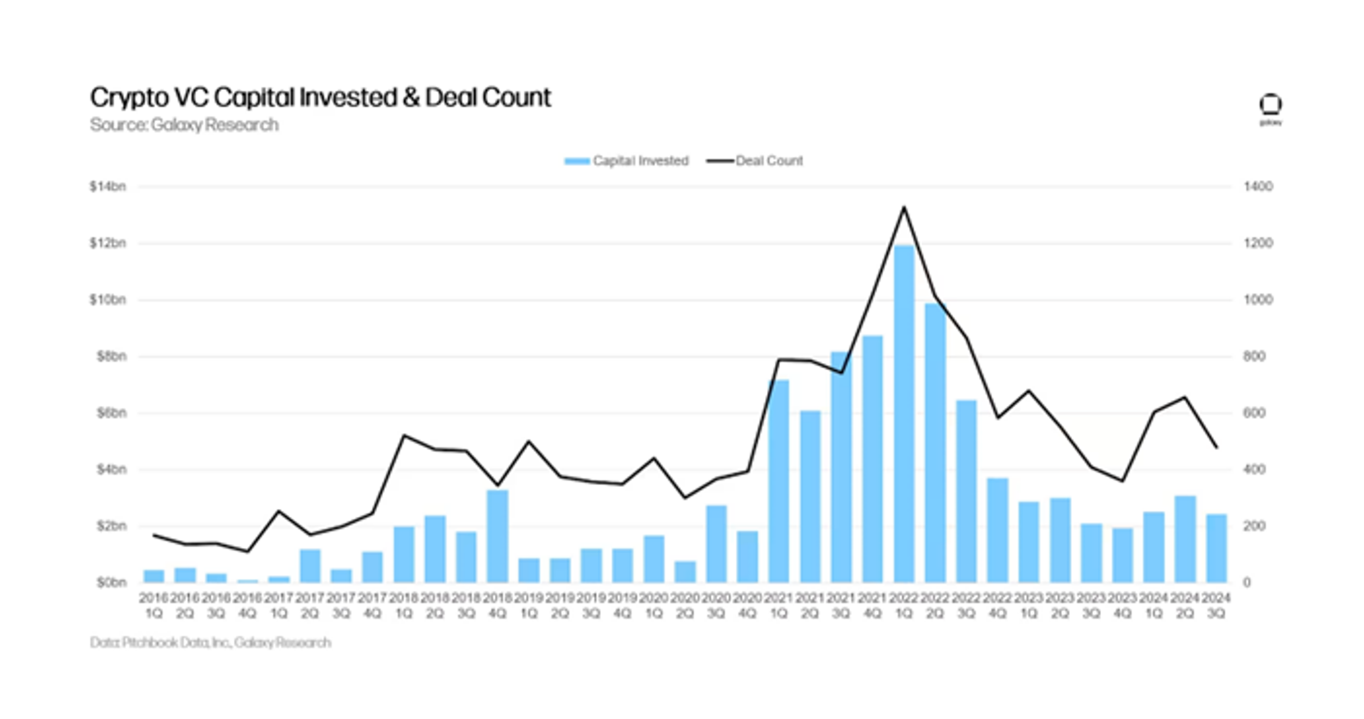 The crypto VC industry has experienced significant shifts in recent years, shaped by market volatility, regulatory challenges, and evolving investment strategies. In the earlier days, crypto was even more of a speculative and risk-on asset. Most, if not all institutions did not adopt crypto into their investment portfolios as it was simply too volatile. However, there was still demand from groups of Accredited Investors (AIs) who saw crypto as a sector that had high risk but offered high rewards. This group of risk-taking AIs were the liquidity providers (LPs) for the crypto VC funds back in 2015-2017. It wasn’t until 2018 where crypto picked up more traction as people saw the potential of crypto VC to provide outsized returns via a moonshot approach, riding off the back of the Intial Coin Offering (ICO); crypto VC was like traditional VC but on steroids. Then came 2021 where this “fear of missing out (fomo)” proliferated, inciting more capital to flow into crypto VCs as AIs and institutional investors alike fought for the piece of the pie. This resulted in a peak of nearly US$12 billion invested in the first quarter of 2022, an all-time high.